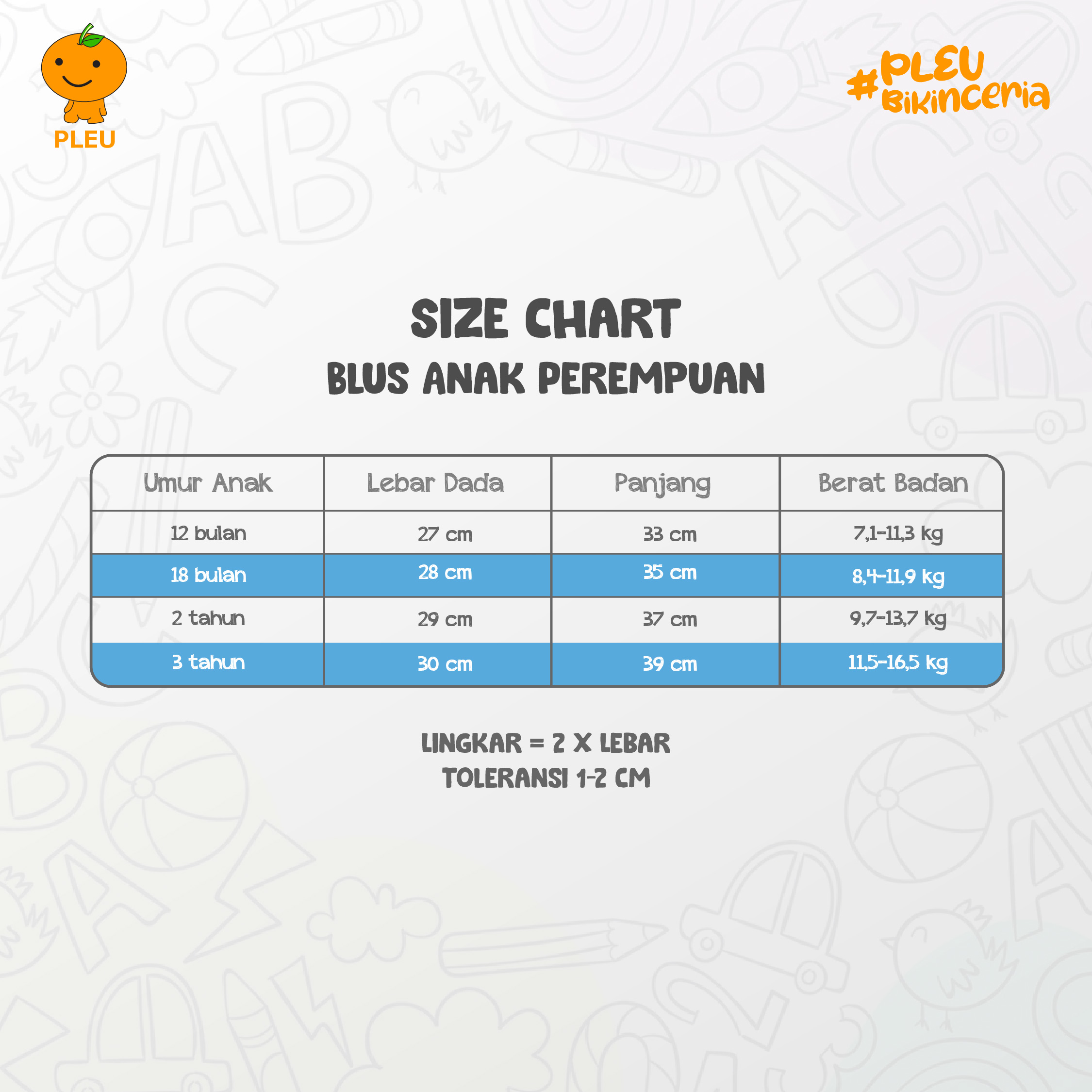 – Ukuran : 12 bulan, 18 bulan, 2 tahun, dan 3 tahun
