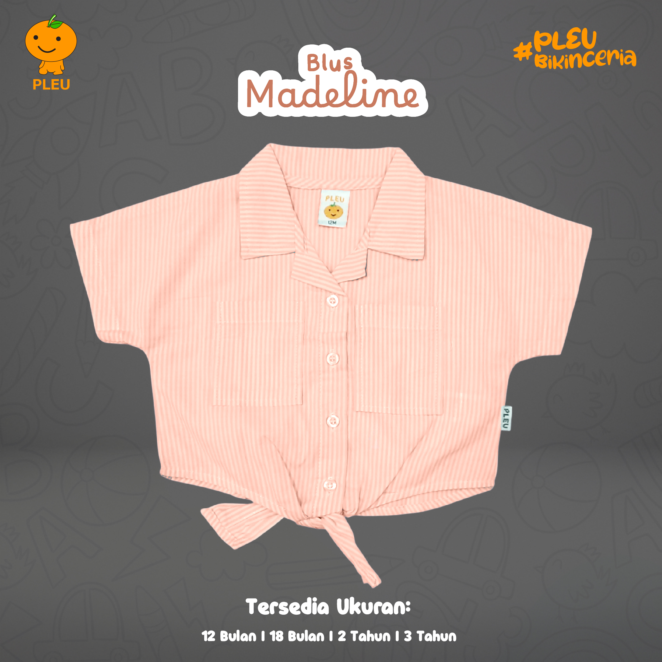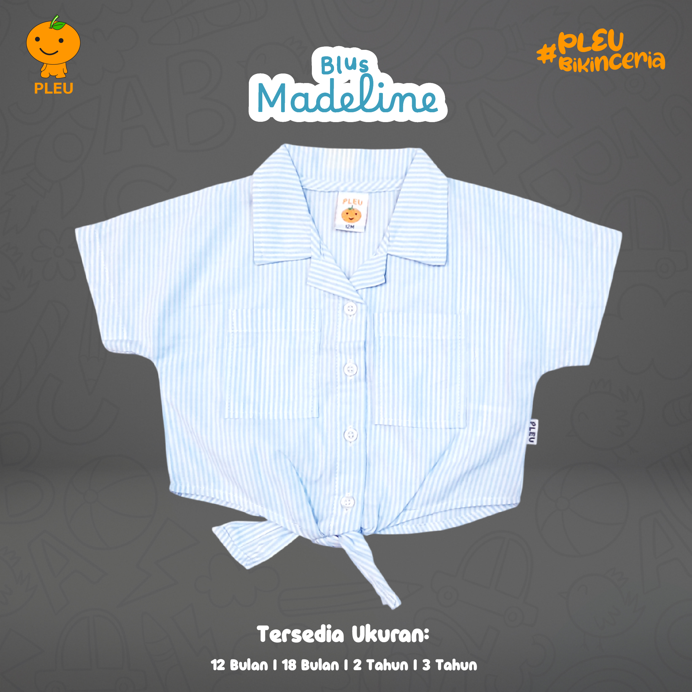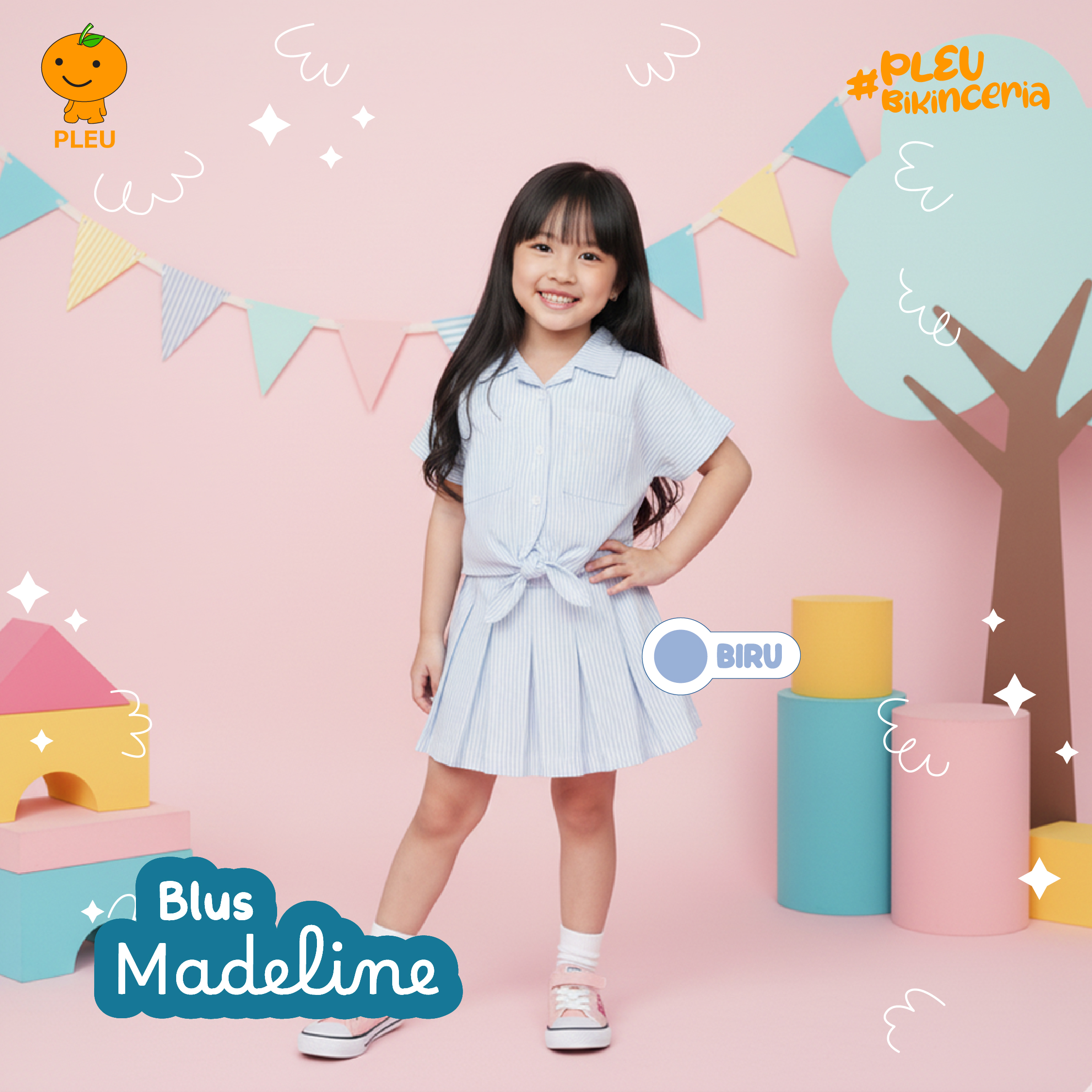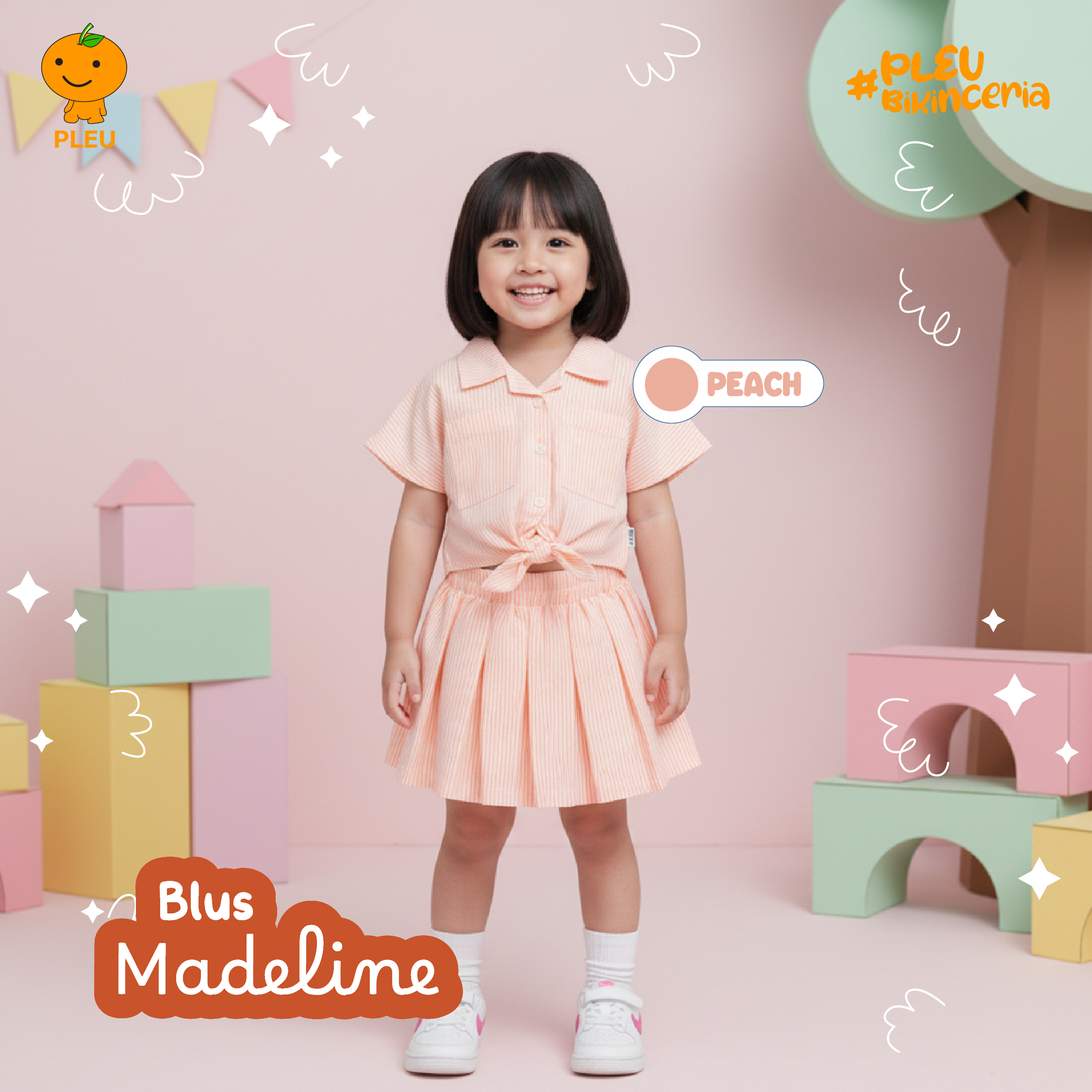 Blus Madeline (12 bulan–3 tahun) hadir dalam dua warna manis—biru stripe lembut dan peach polos—dengan model crop tie-front yang trendy dan kerah klasik untuk tampilan imut tapi rapi. Keunikan: motif garis halus pada versi biru memberi tekstur visual yang chic, dua saku depan menambah detail fungsional, dan ikatan depan (tie-front) memudahkan penyesuaian panjang serta menambah gaya playful; potongan longgar memberi ruang gerak nyaman untuk si kecil. Terbuat dari campuran katun berkualitas yang lembut, breathable, dan mudah dicuci serta sudah bersertifikat SNI, aman untuk kulit sensitif anak, tidak mudah pudar, dan tahan pakai—pilihan stylish dan praktis untuk aktivitas sehari-hari maupun acara keluarga.