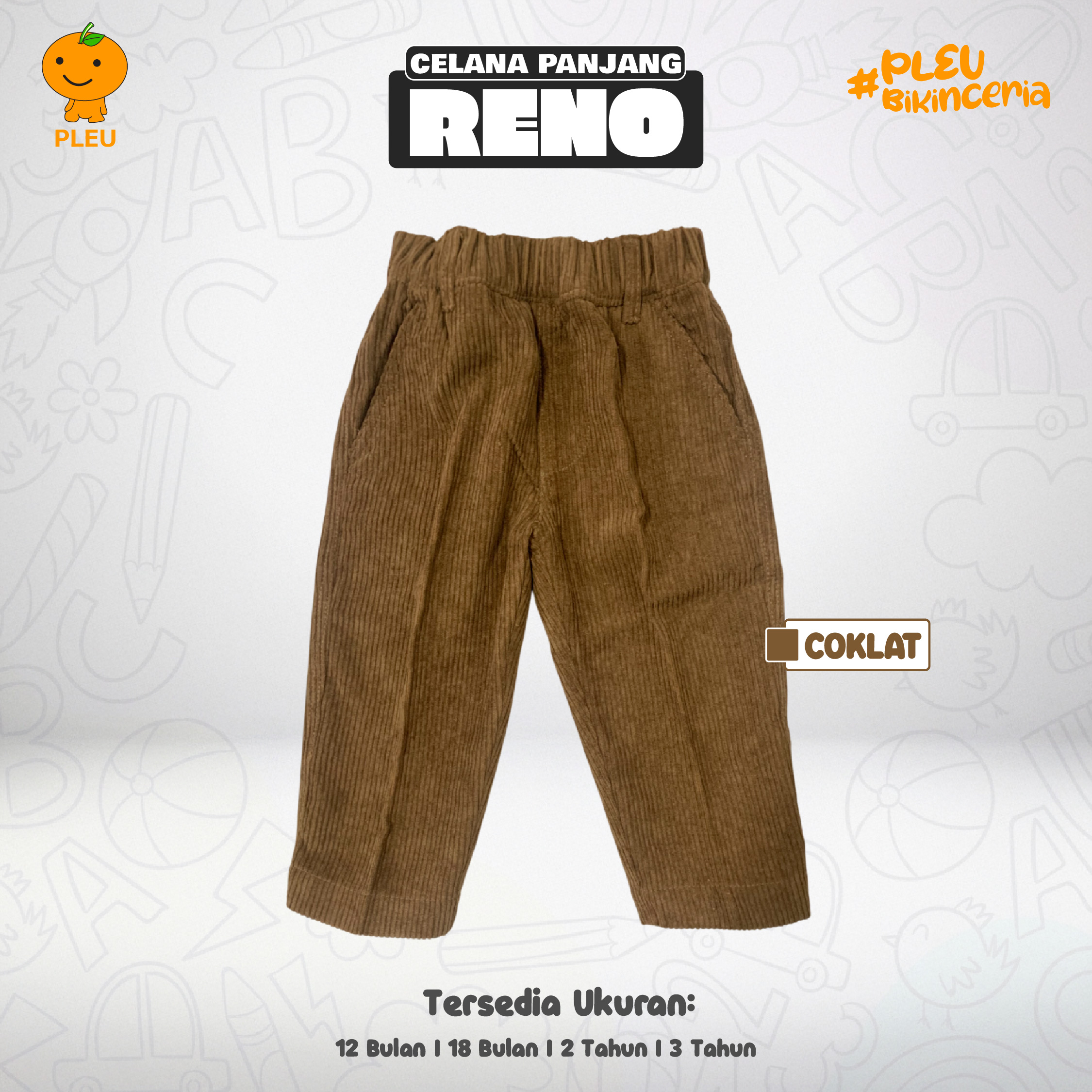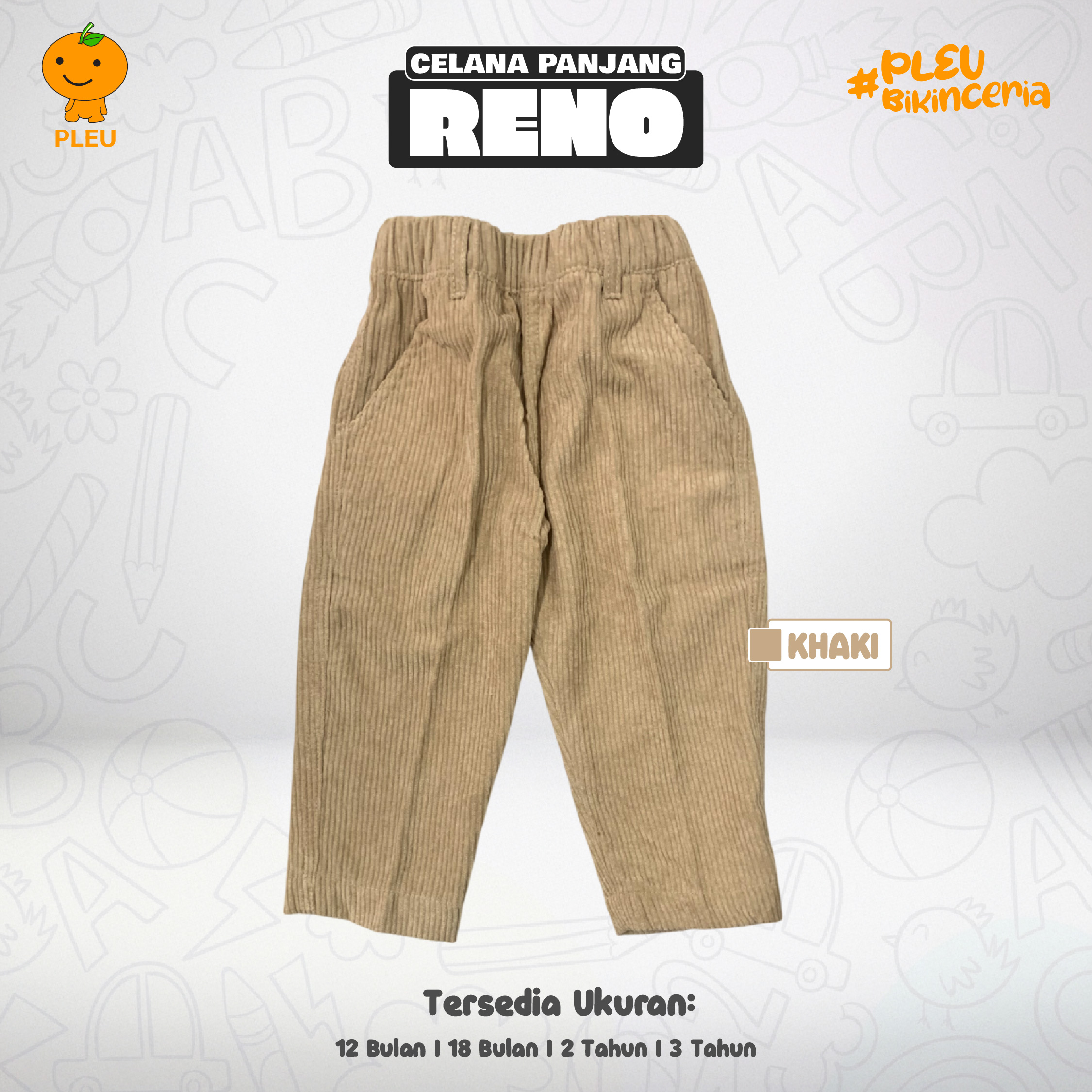 Celana Panjang Reno hadir dalam dua warna hangat: Cokelat dan Khaki, ukuran 12 bulan – 3 tahun. Potongan corduroy lembut dengan pinggang elastis memberi kenyamanan sepanjang hari, plus kantung praktis untuk mainan kecil si kecil. Potongan agak cropped hingga betis membuat gaya tetap modern saat dipakai dengan sepatu sneakers atau boots kecil. Bahan corduroy berkualitas, terasa lembut di kulit, bernapas, mudah dirawat, dan tahan lama untuk aktivitas aktif anak. Semua material telah bersertifikat SNI, menjamin keamanan kain, kekuatan jahitan, serta kenyamanan maksimal bagi tumbuh kembang si kecil.
