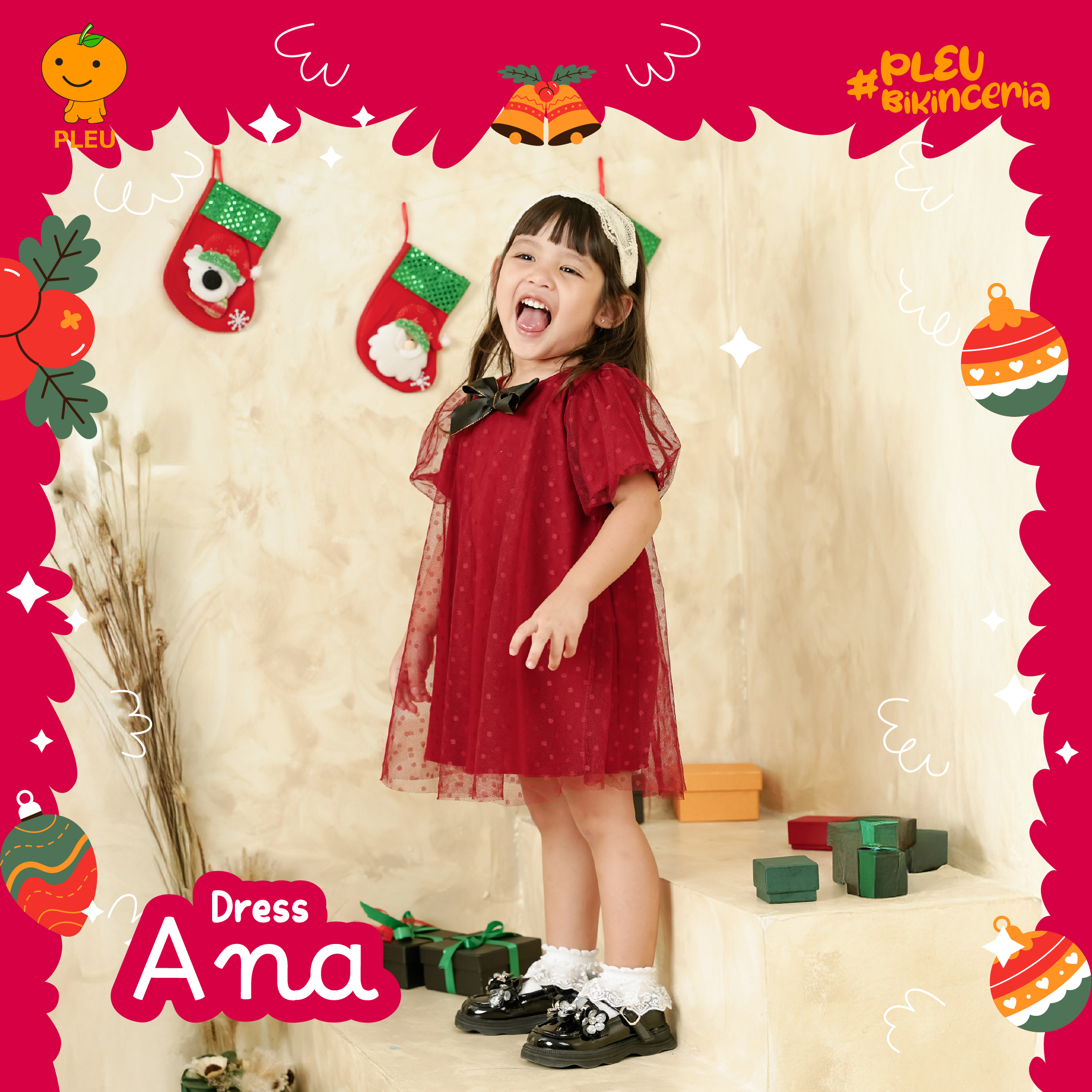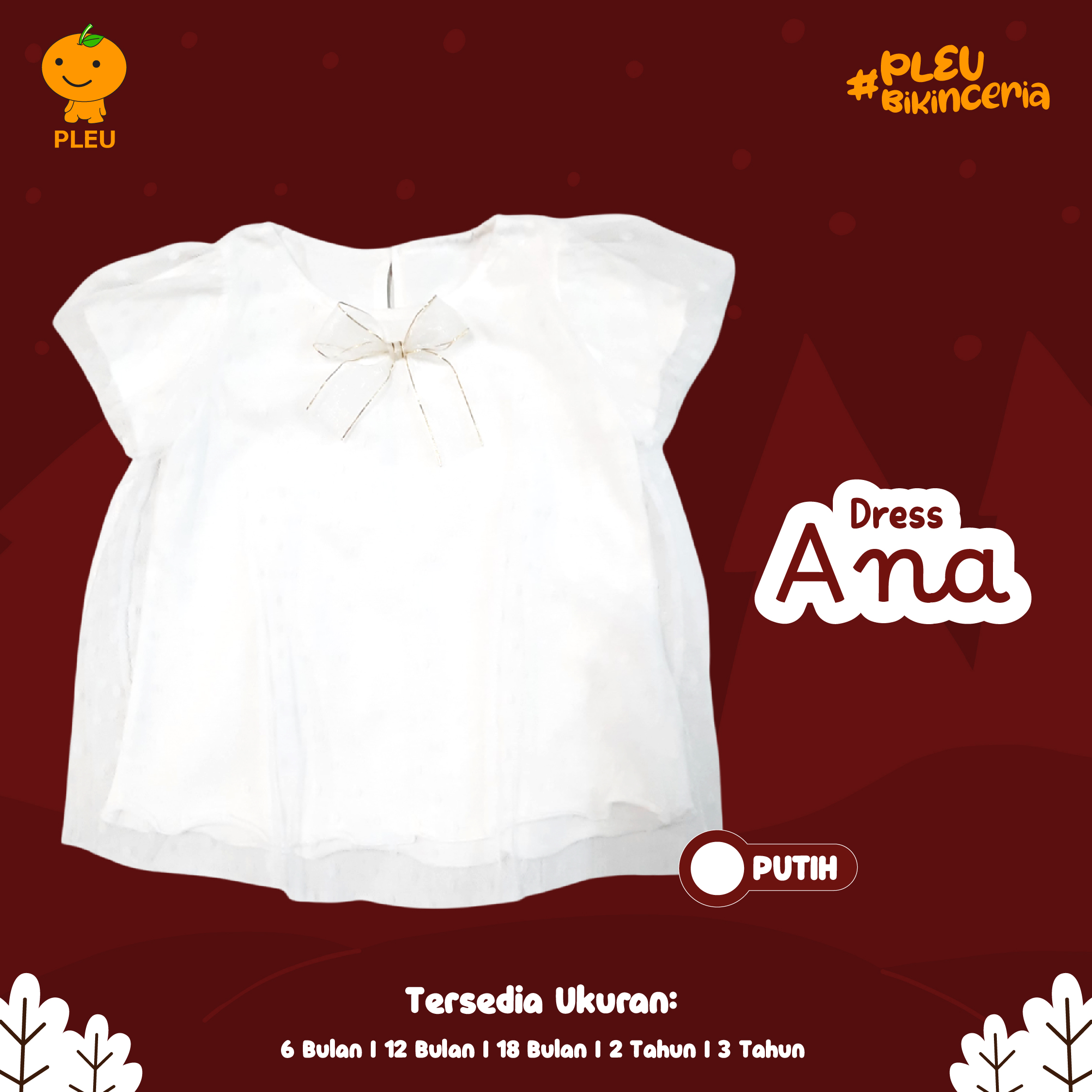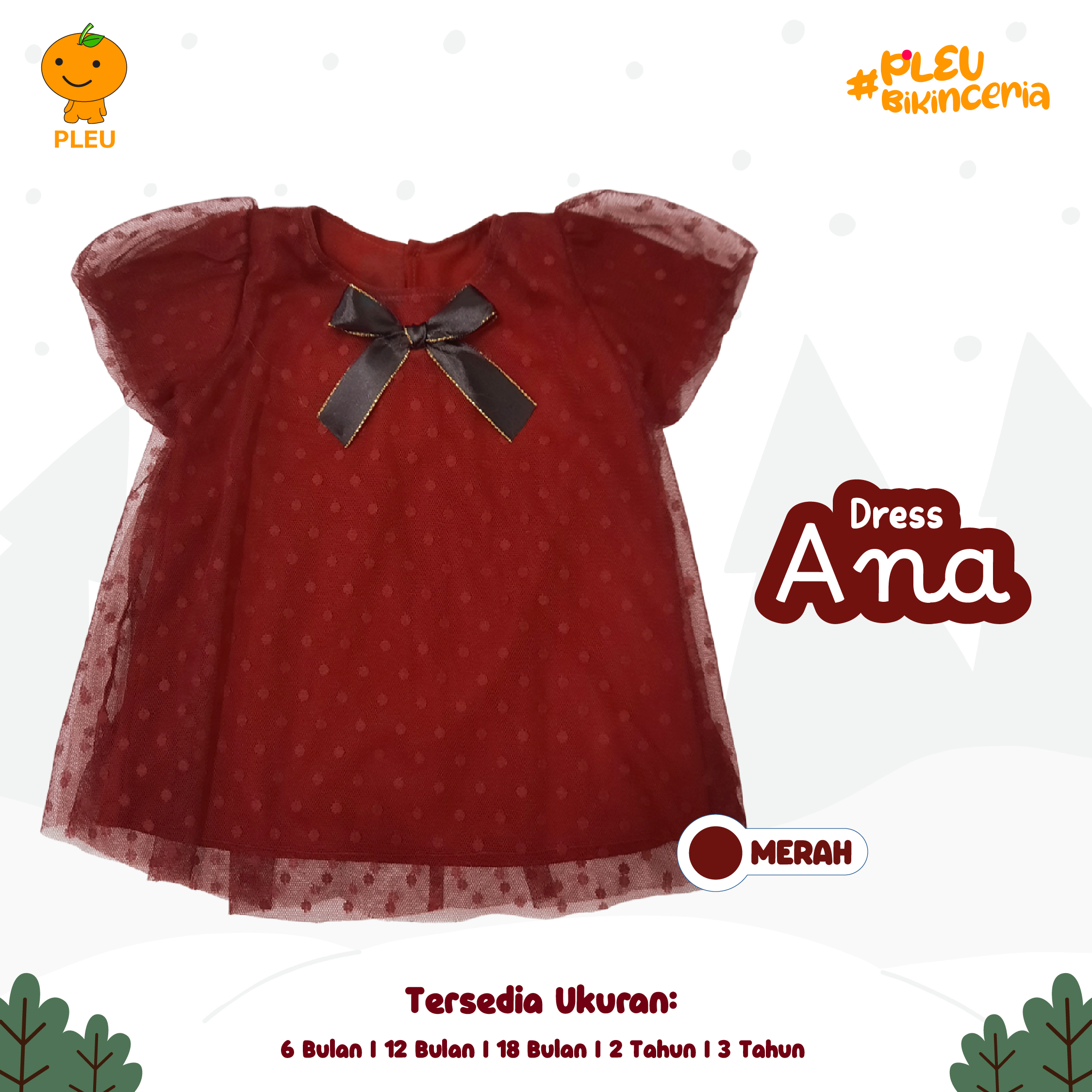 Dress Ana (6 bulan–3 tahun) hadir dalam warna merah dan putih elegan dengan layer tulle bertitik halus yang memberi efek dreamy dan fotogenik—hiasan pita kontras di dada menambah sentuhan manis tanpa berlebihan. Keunikan: model A-line longgar memberi ruang gerak bebas untuk bayi, lengan puff ringkas yang lembut membuat siluet makin imut, dan kancing belakang memudahkan saat mengganti popok; bahan innernya lembut dan breathable sehingga nyaman untuk kulit sensitif. Terbuat dari kain berkualitas yang mudah dirawat dan sudah bersertifikat SNI, bahan tidak mudah pudar dan aman dipakai seharian—pilihan stylish, nyaman, dan aman untuk momen spesial maupun keseharian si kecil.
