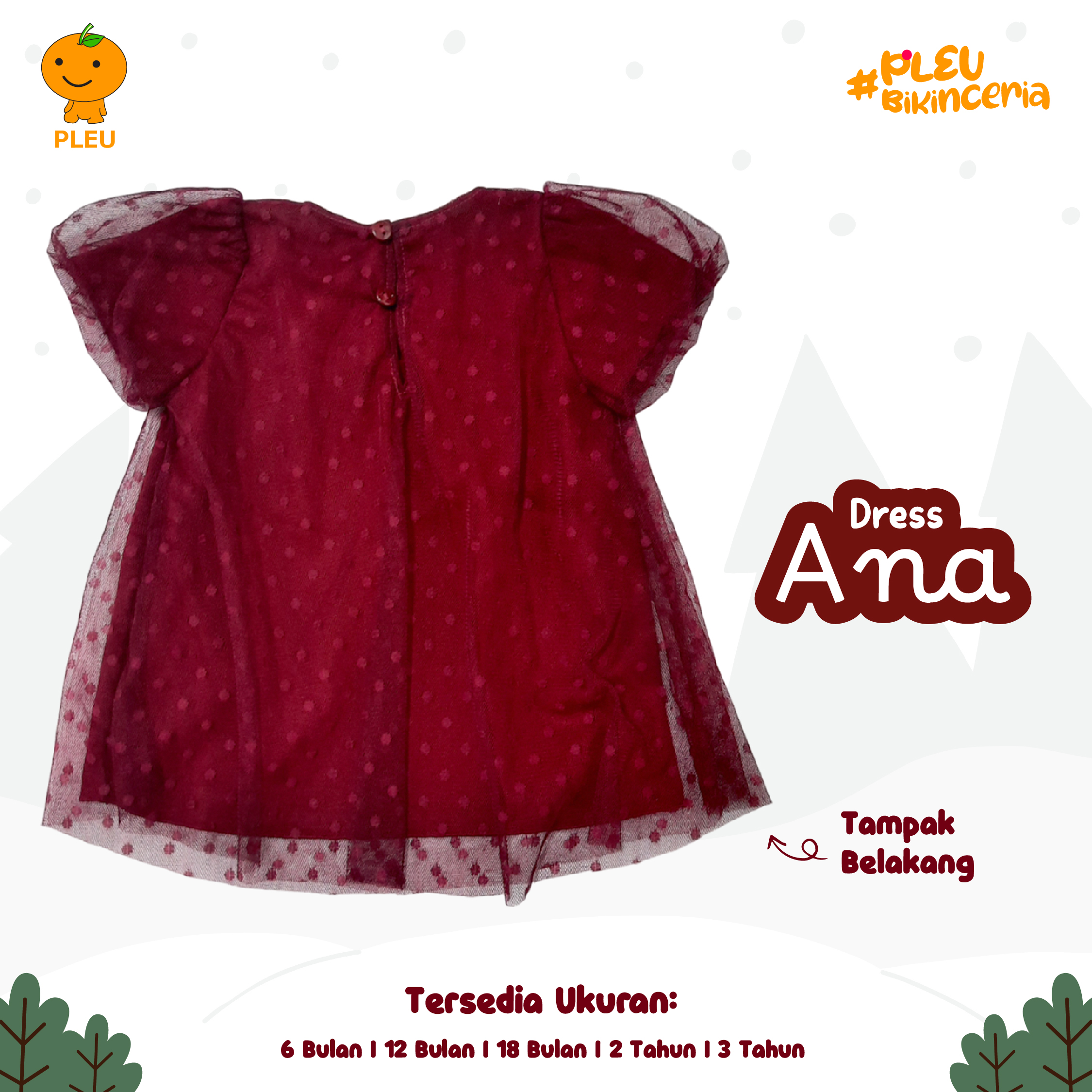 – Ukuran : 6 bulan, 12 bulan, 18 bulan, 2 tahun, dan 3 tahun