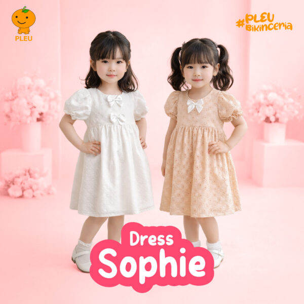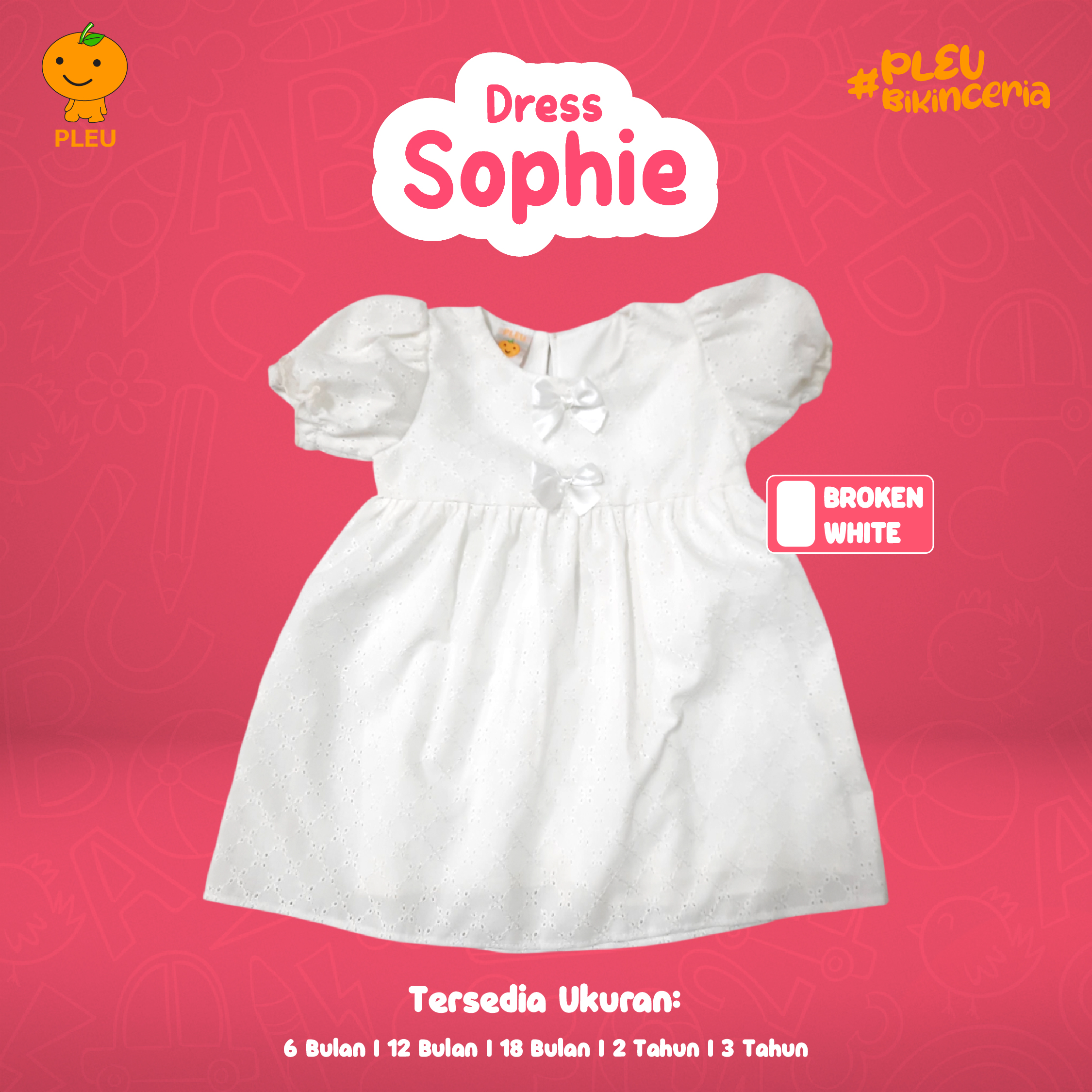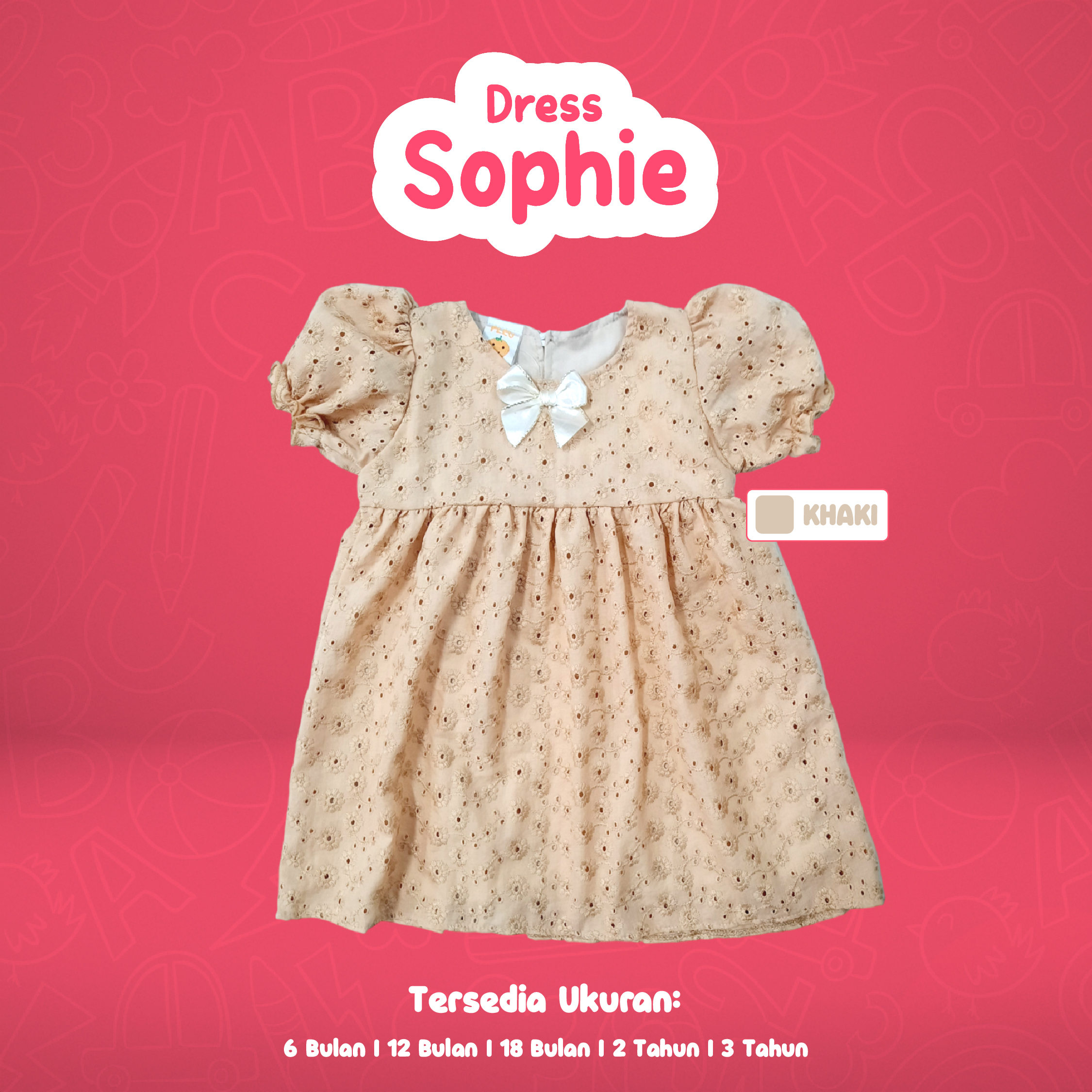 Dress Sophie hadir dalam dua pilihan warna Broken White dan Khaki untuk ukuran 6 bulan hingga 3 tahun. Dress ini menawarkan gaya chic dengan kain broderie anglaise ber motif bunga halus, bodi atasan mengalir ke rok penuh yang anggun, serta detail pita putih di dada yang memberikan sentuhan manis. Keunikan utama adalah detail puff-sleeve yang lembut dan sirkulasi udara yang baik, membuat bayi tetap nyaman sepanjang hari. Bahan utama berupa katun berkualitas tinggi, lembut di kulit, adem, dan mudah dirawat. Semua material telah bersertifikat SNI, menjamin keamanan kain, kekuatan jahitan, serta kenyamanan saat bermain, belajar, dan beraktivitas harian si kecil.