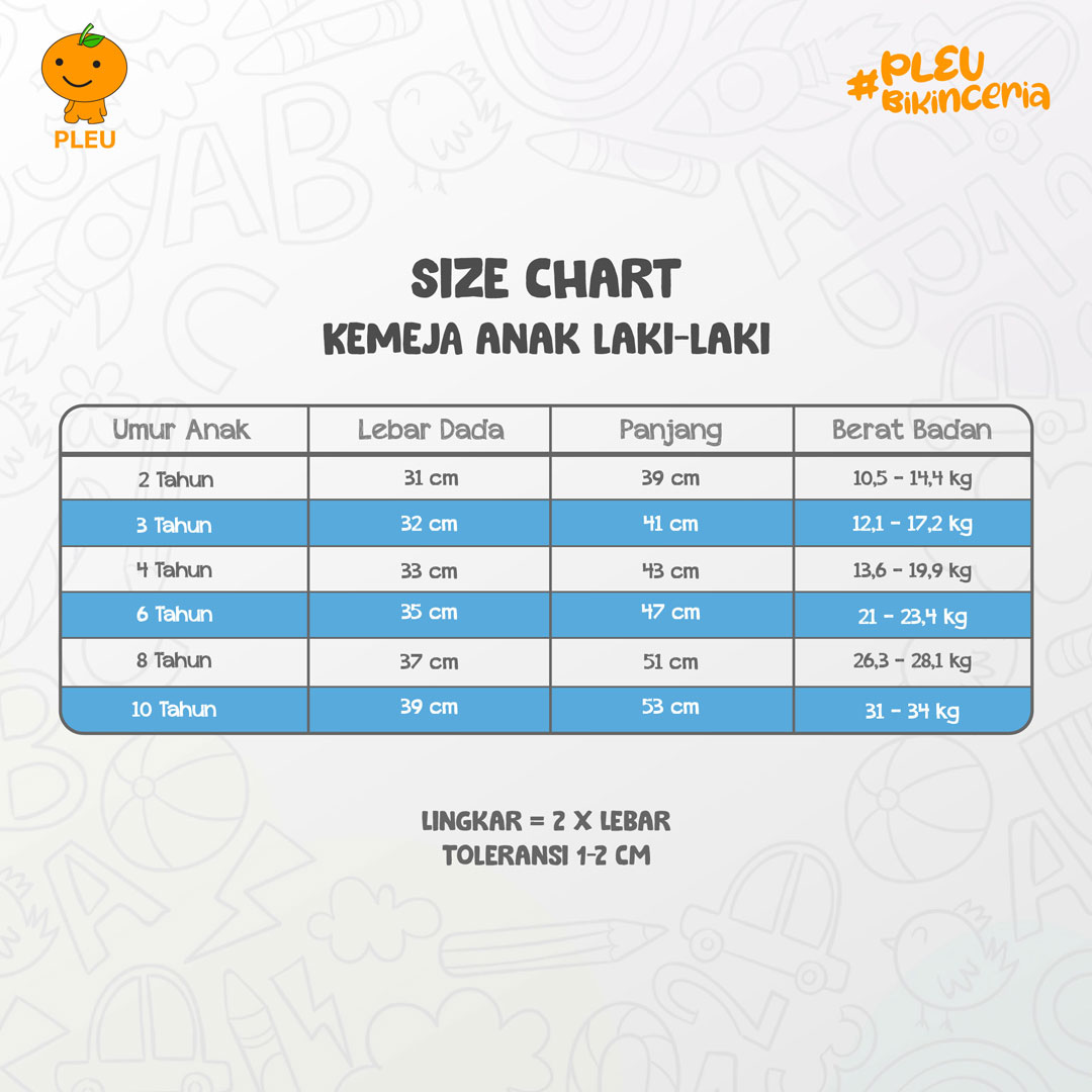 – Ukuran : 2 tahun, 3 tahun, 4 tahun, 6 tahun, 8 tahun, dan 10 tahun