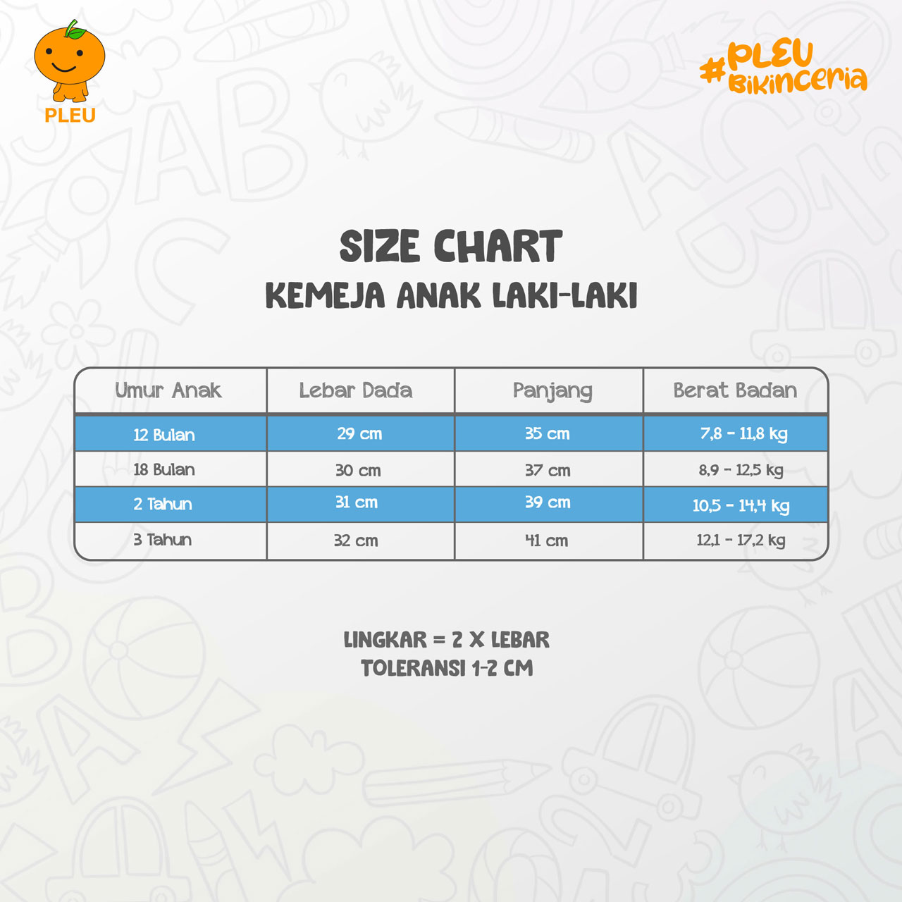 – Ukuran : 6 bulan, 12 bulan, 2 tahun, dan 3 tahun