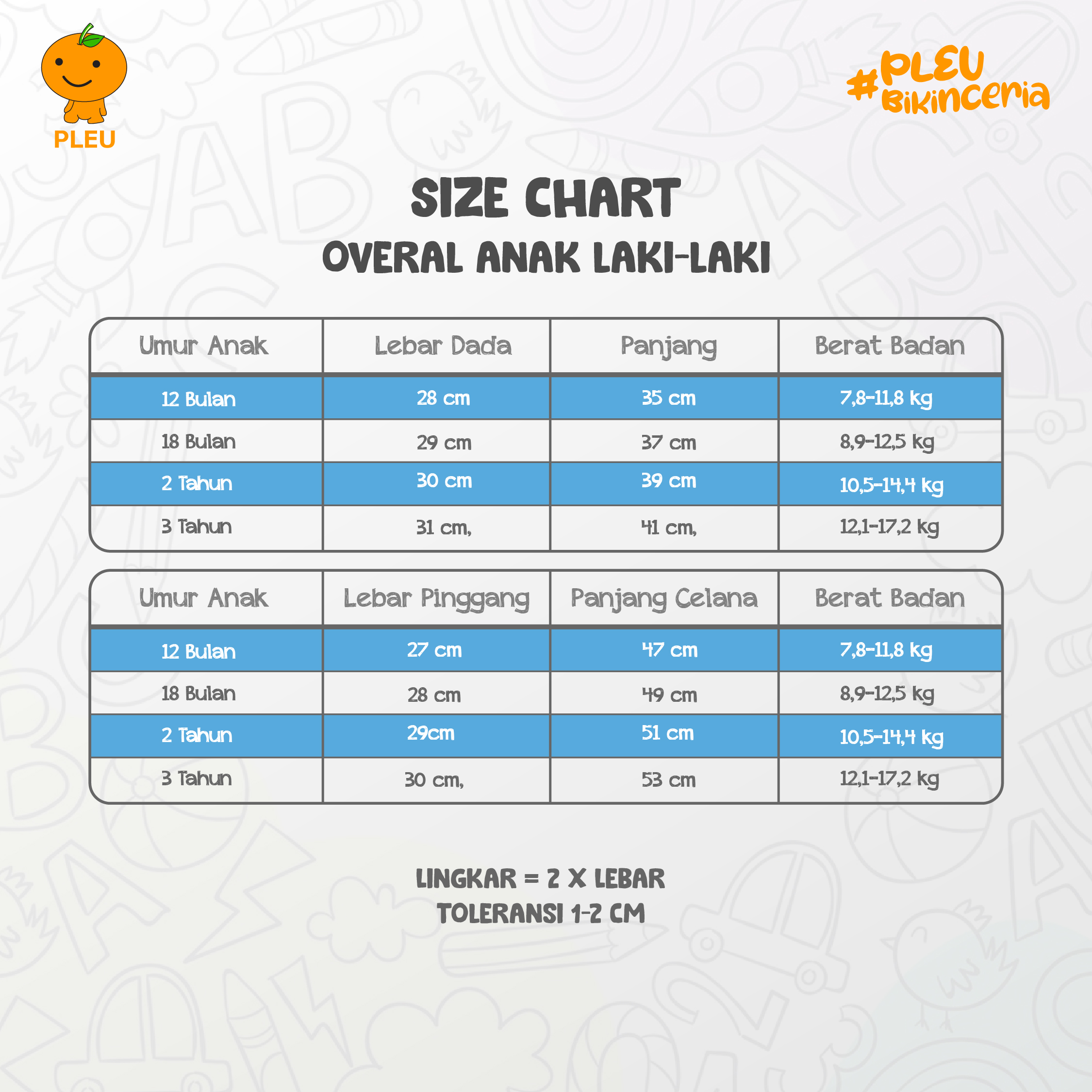 – 12 bulan : Lebar Dada 28 cm, Panjang Kaos 35 cm, Lebar Pinggang 27 cm, Panjang Celana 47 cm, Berat Badan 7,8-11,8 kg