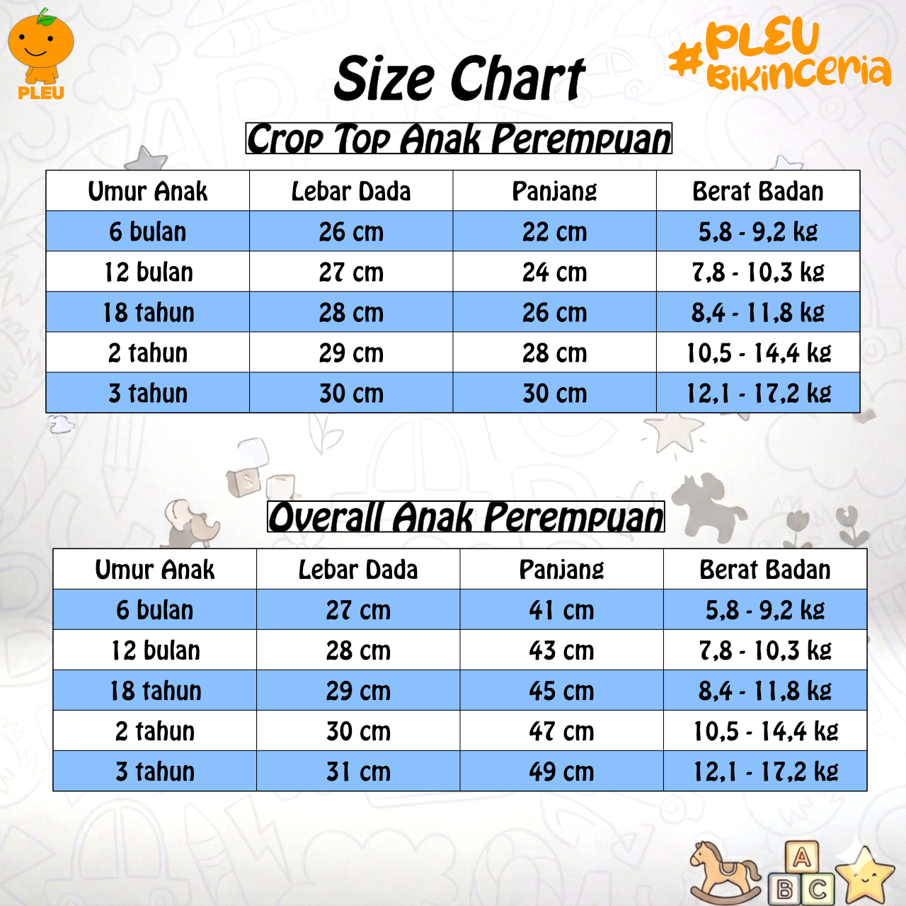 – 18 bulan : Lebar Dada 26 cm, Panjang 32 cm, Lebar Overall 29 cm, Panjang Overall 45 cm, Berat Badan 8,4-11,9 kg