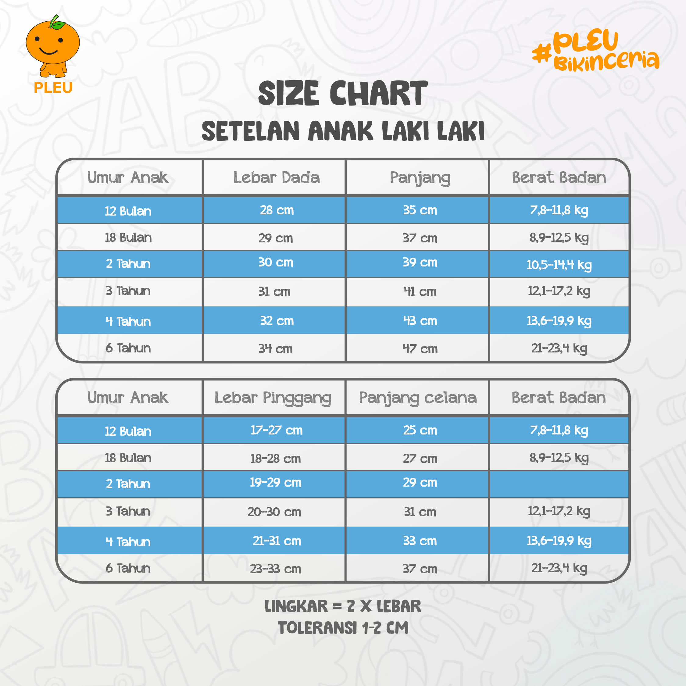 ● 12 bulan : Lebar Dada 28 cm, Panjang 35 cm, Lebar Pinggang 17-27 cm, Panjang Celana 25 cm, Berat Badan 7,8-11,8 kg