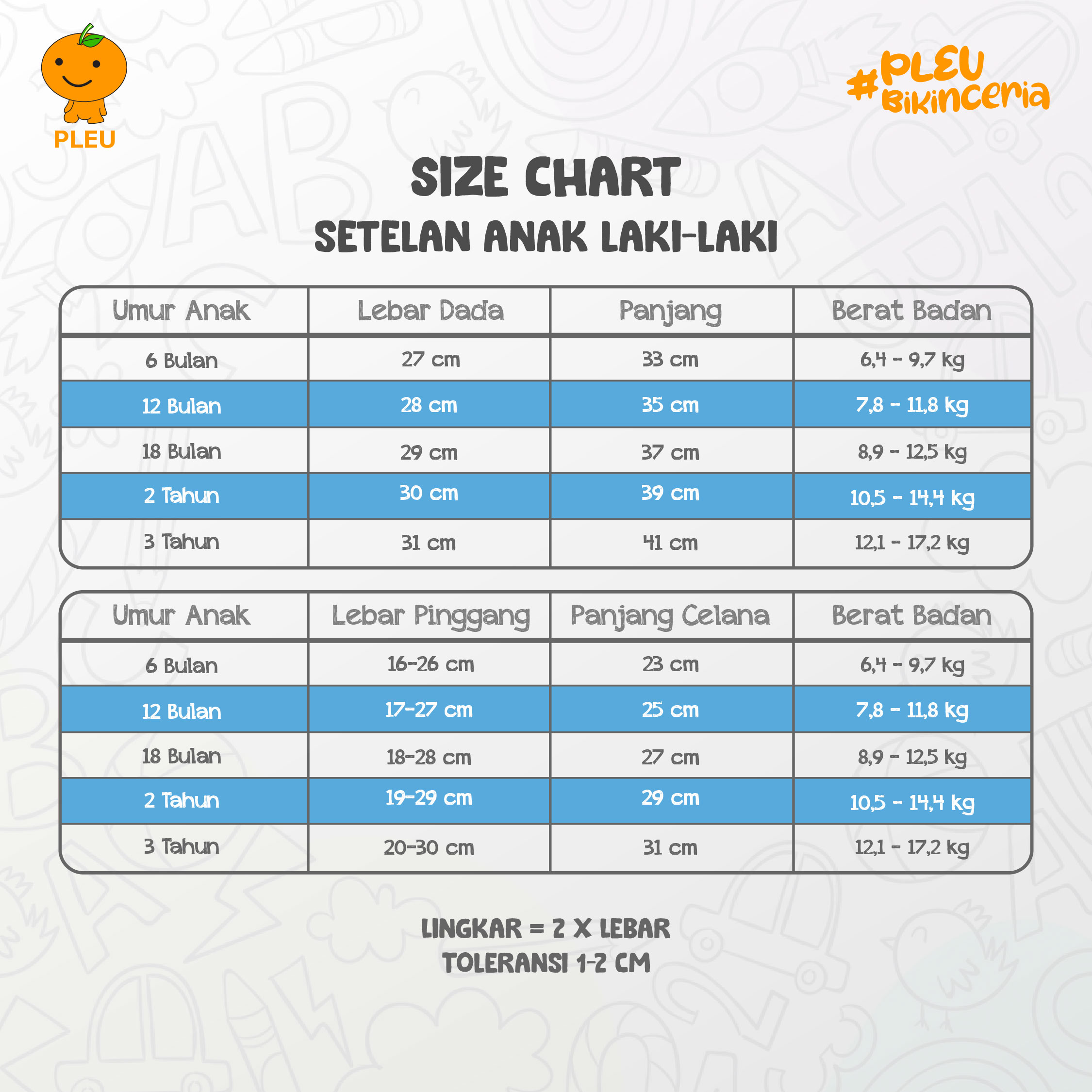● 12 bulan : Lebar Dada 28 cm, Panjang 35 cm, Lebar Pinggang 17-27 cm, Panjang Celana 25 cm, Berat Badan 7,8-11,8 kg