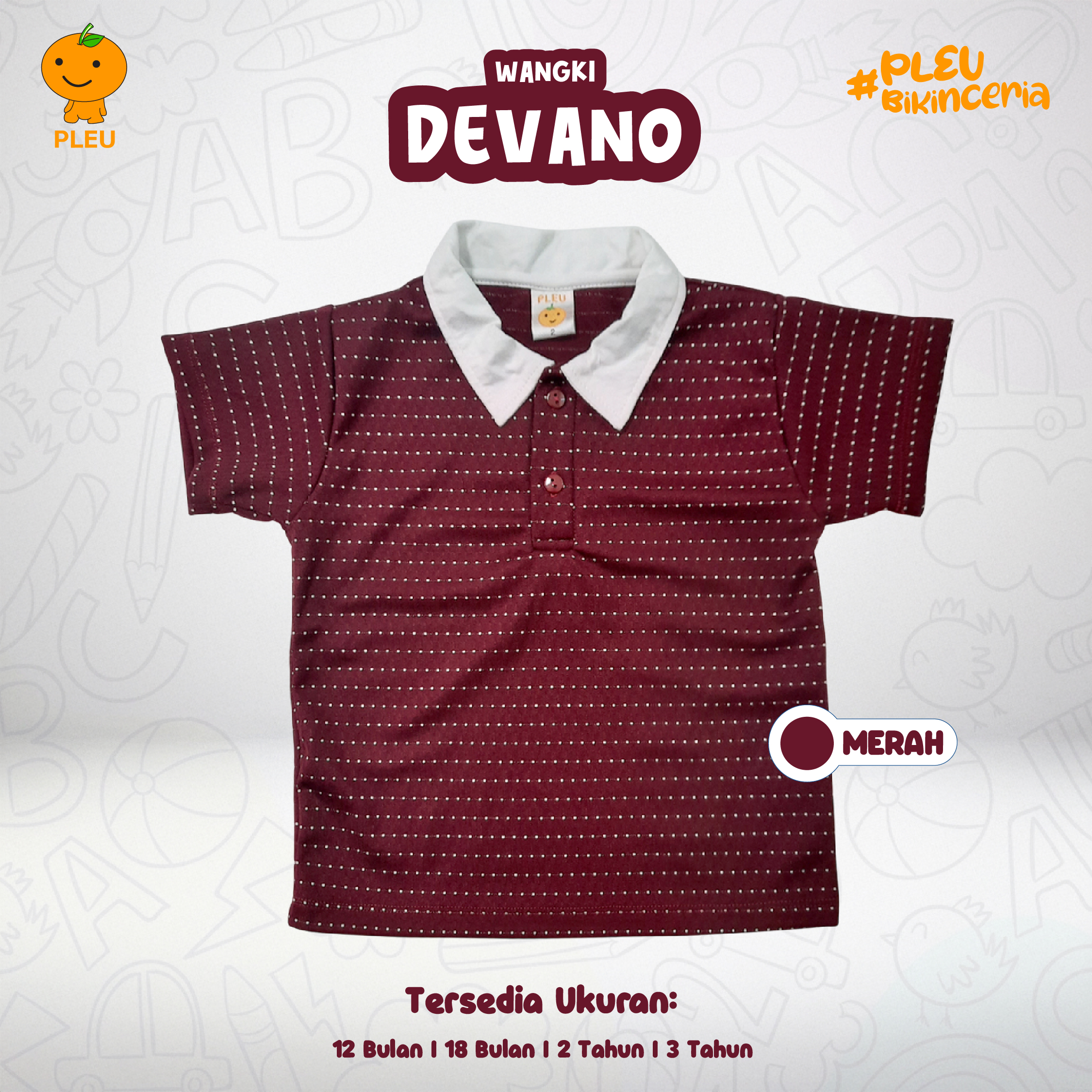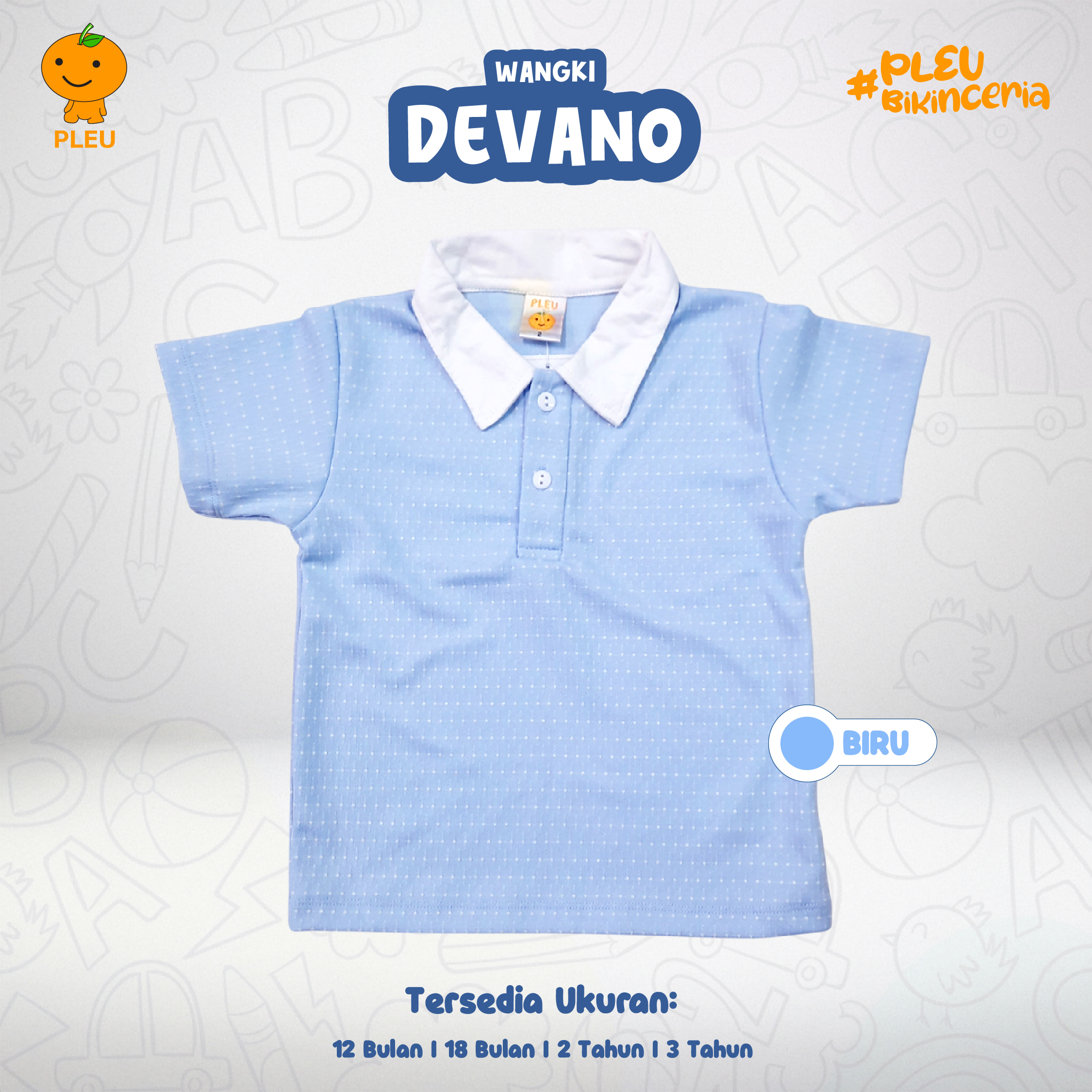 Wangki Devano (12 bulan–3 tahun) hadir dalam dua pilihan warna segar—biru muda dan marun—dengan motif titik-titik halus yang memberi sentuhan playful tapi tetap rapi; kerah putih kontras menambah kesan smart dan mudah dipadu-padankan. Keunikan: model polo pendek dengan kancing praktis di bagian depan membuat pemakaian cepat dan nyaman, potongan longgar memberi ruang gerak leluasa untuk bermain, dan bahan yang lembut serta breathable cocok untuk kulit sensitif anak. Terbuat dari kain berkualitas yang mudah dirawat dan sudah bersertifikat SNI, tahan pudar, serta nyaman dipakai seharian—pilihan praktis, stylish, dan aman untuk aktivitas harian si kecil.