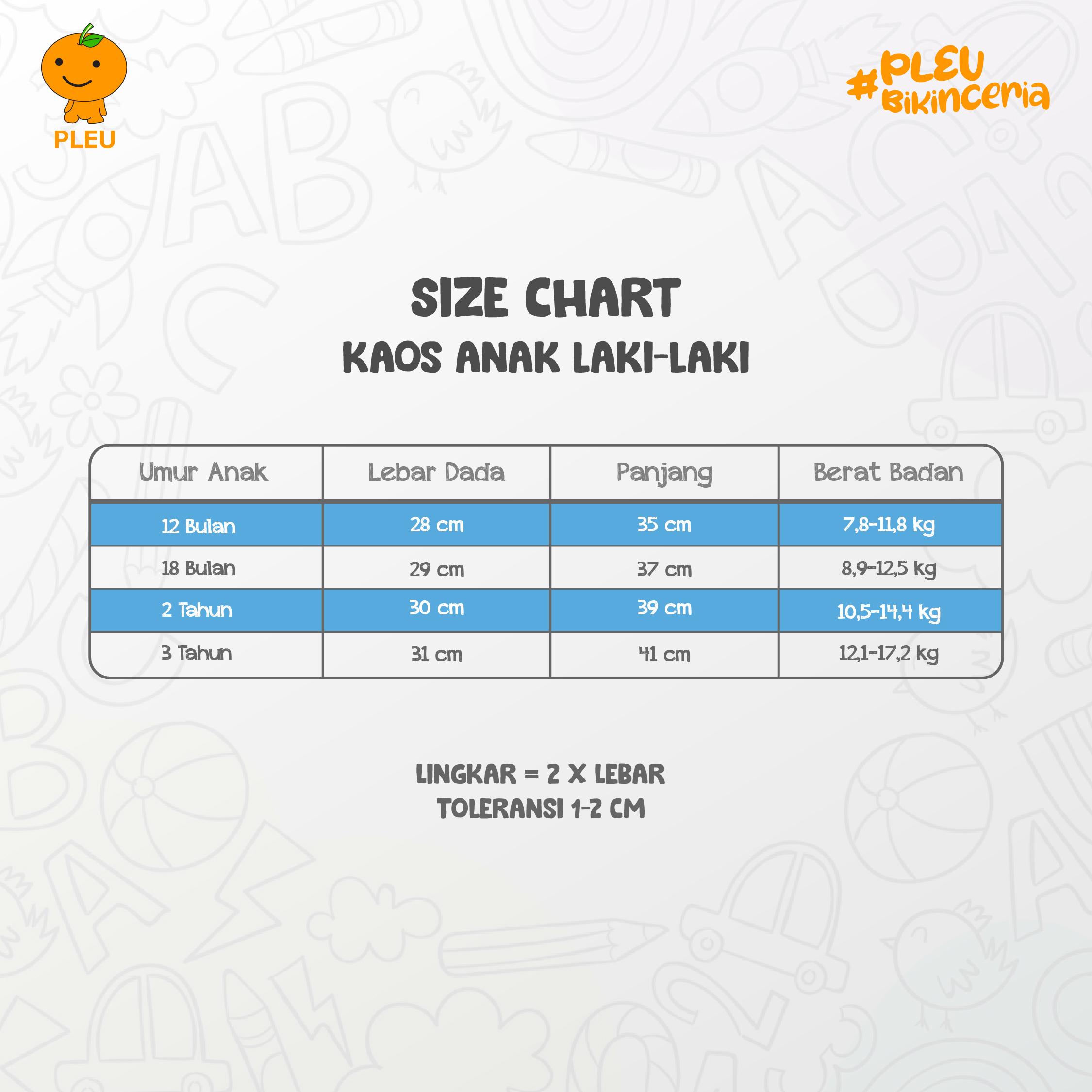 ● 12 bulan : Lebar Dada 28 cm, Panjang 35 cm, Berat Badan 7,8-11,8 kg